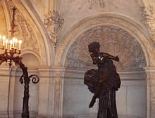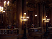でも幕間のときにシャンパンを飲んだりしたギャラリー(フォワイエ)に行けば、貴方も満足するはずだ。53mの長さはヴェルサイユの鏡の間には及ばないが、改装されたばかり、というのがよく分るのがここである。2kgの金が使われて一新された。音楽を表わす天井画、トロンプ・ルイユの鏡、まわりの金箔と調和した色のドレープをふんだんに使ったカーテン。モダンな劇場では味わうことの出来ないゴージャスなノスタルジー効果は満点である。天井画の一隅にはガルニエの肖像も。周りには人頭彫刻が壁沿いに並んでいるが、端のほうを見ていただきたい。電気線のスパイラルを首に巻きつけた女神像があり、最新テクノロジーであった、電気というものに対してオマージュをささげている訳である。バルコニーからフォワイエに続く廊下部分も、贅を凝らしたモザイクで出来ていて圧巻である。自分を当時の観客にイメージすれば楽しさが2倍になる。 |
